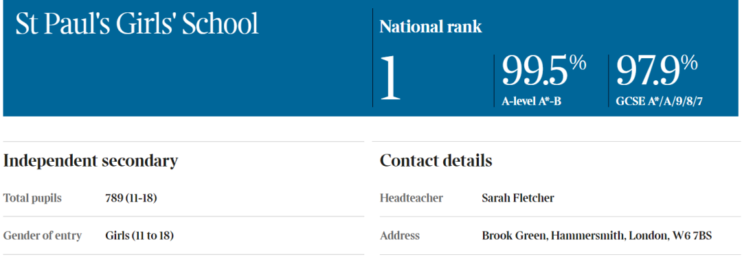圣保罗女子中学位于英国,是一所走读、女校公学,招收11-18岁的女生,现有789名学生。圣保罗女子中学是英国九所顶尖公学之一,特别注重学生的全面发展,在人文学科、数学和科学等方面都努力提高。此外,圣保罗女子中学2022年A-Level考试成绩排名英国第一,99.5%的学生获得了B以上好成绩,在GCSE考试中,获得A*/A/9/8/7成绩的比例也达到了97.9%。学校已经连续四年位列英国公立学校排名第一。